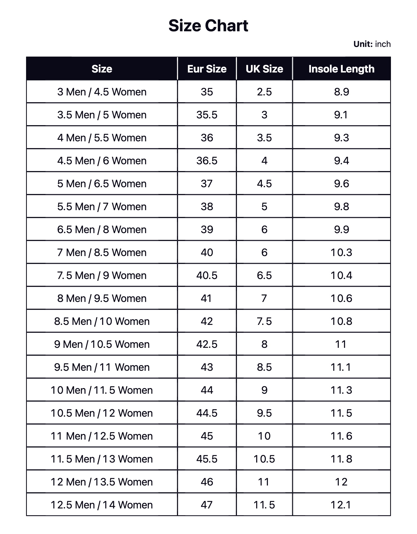 | Size | 4 Men / 5.5 Women, 5 Men / 6.5 Women, 5.5 Men / 7 Women, 6.5 Men / 8 Women, 7 Men / 8.5 Women, 8 Men / 9.5 Women, 8.5 Men / 10 Women, 9.5 Men / 11 Women, 10 Men / 11.5 Women, 11 Men / 12.5 Women, 12 Men / 13.5 Women, 12.5 Men / 14 Women, 3 Men / 4.5 Women, 3.5 Men / 5 Women, 4.5 Men / 6 Women, 7.5 Men / 9 Women, 9 Men / 10.5 Women, 10.5 Men / 12 Women, 11.5 Men / 13 Women |